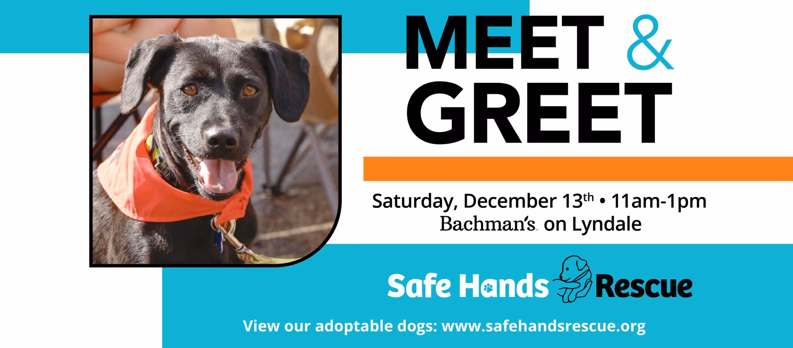 Bachman's on Lyndale Main Store 6010 Lyndale Ave. S., Minneapolis, MN, United StatesJoin us at Bachman’s Lyndale for a Meet & Greet with Safe Hands Rescue where available puppies and adult dogs will be in attendance ready to find their forever families.…