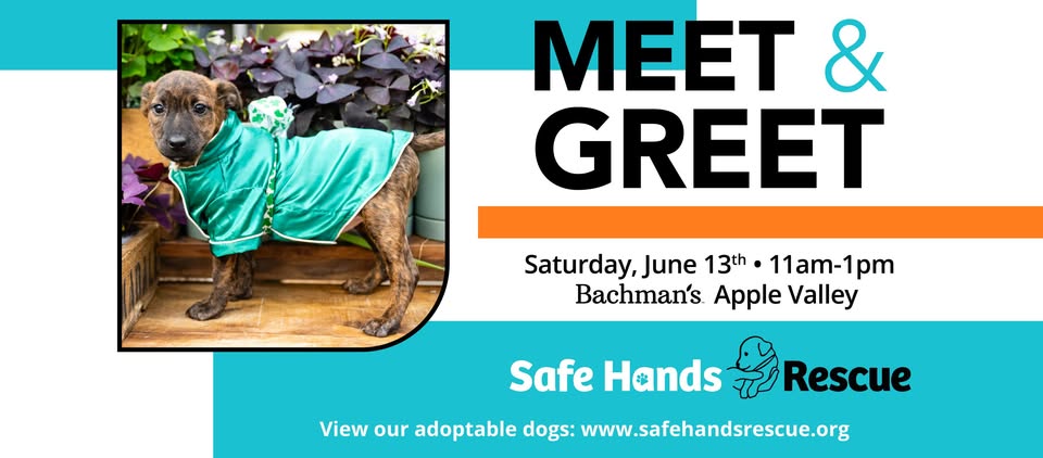 Bachman's - Apple Valley 7955 150th St. W, Apple Valley, MN, United StatesJoin us at Bachman’s in Maplewood for a Meet & Greet withSafe Hands Rescue where available puppies and adult dogs will be in attendance ready to find their forever families.…