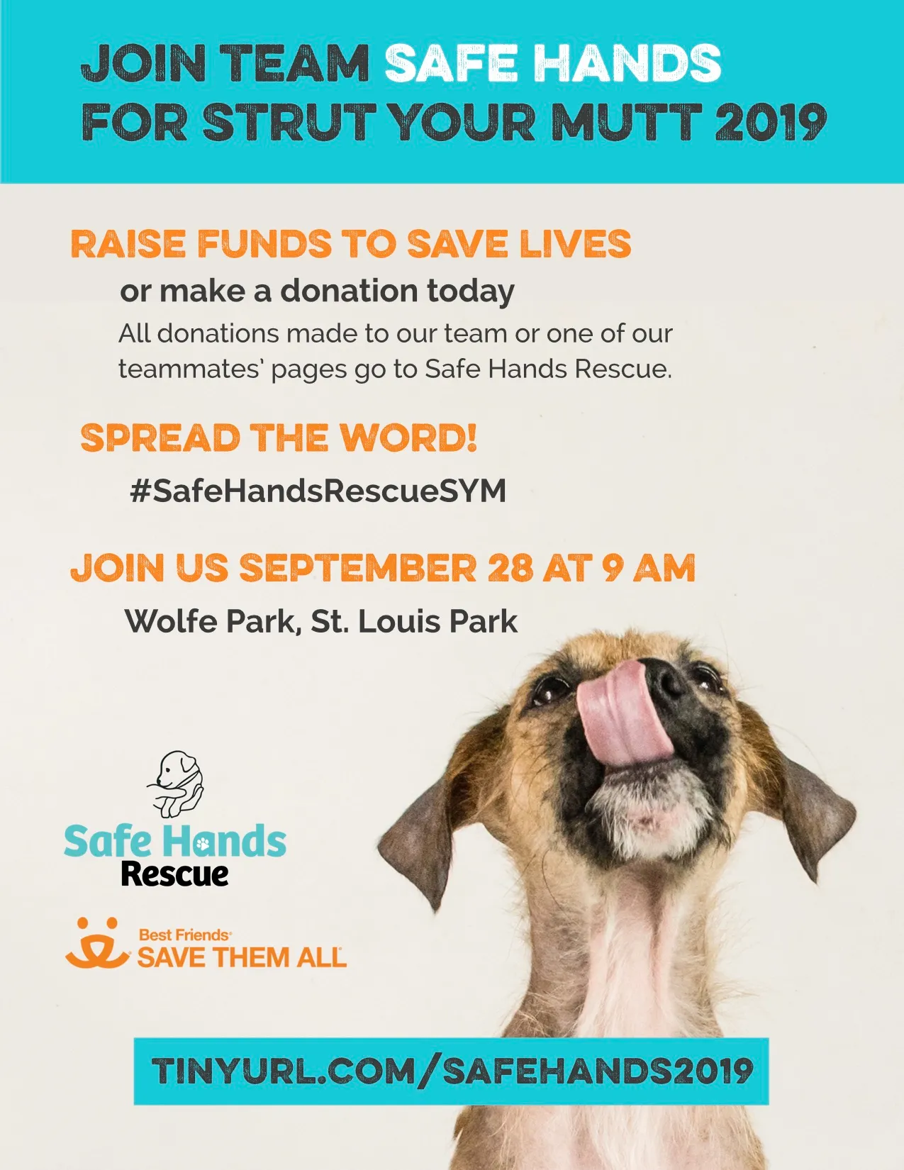 « All Events This event has passed. Safe Hands Rescue – Strut Your Mutt September 28, 2019 @ 9:00 am - 1:00 pm « Safe Hands Meet & Greet – at Bentley’s on France Safe Hands Meet & Greet » Add to calendar Google Calendar iCalendar Outlook 365 Outlook Live Details Date: September 28, 2019 Time: 9:00 am - 1:00 pm Website: http://support.bestfriends.org/site/TR?team_id=7914&fr_id=1407&pg=team Organizer Safe Hands Rescue Email safehandsrescue@gmail.com View Organizer Website Venue Wolfe Park 3700 Monterey Drive St. Louis Par,, MN 55416 United States + Google Map View Venue Website